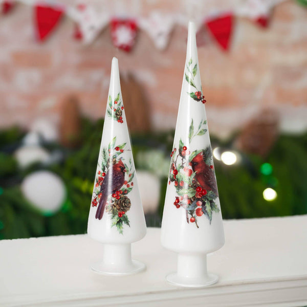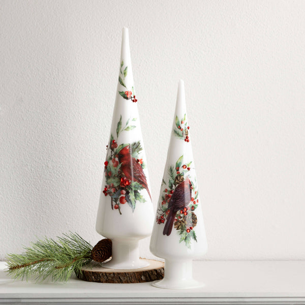These Home Decor trees make decorating for sesasonal festivities a breeze. The white cone trees feature embellishments of cardinals and red berries in a traditional Christmas decor pattern, perfect for adding a touch of natural cheer. Simply place on your mantle or tabletop for an instant holiday feel - nothing left to do but enjoy time with loved ones. -