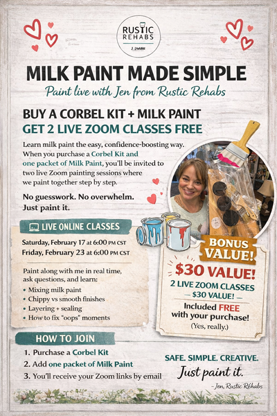 ✨ Bonus: Purchasing a Corbel Kit includes one month of Rustic Rehabs Insider membership, where you’ll learn milk paint techniques with me live on Zoom. We’ll cover prep, mixing, layering, and finishing so you can confidently use milk paint again and again.