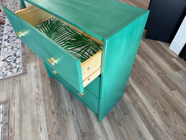 This one-of-a-kind petite dresser is crafted from solid pine and painted in DIY Paint’s Monet’s Garden Green — a lush, happy hue that feels fresh year-round. Open the drawers and surprise… she’s lined with tropical palm print paper because details matter around here. 🌴💚