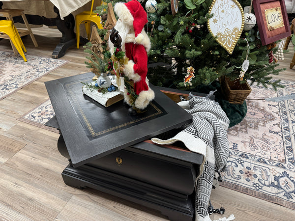 Painted in DIY Black Velvet, he’s sleek, classic, and full of quiet charm. His solid wood top lifts off to reveal a roomy hidden compartment — perfect for storing your: